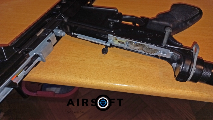 Le corps de la réplique pivote pour accéder très facilement à toute la mécanique interne. Livrée avec plusieurs ressorts pour régler la puissance, des rails additionnels et des pièces de rechange (voir photo).